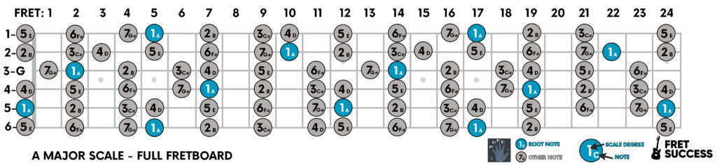 The fretboard diagram below shows the full A major scale across all positions so you’re not stuck in one box wondering where to go next.