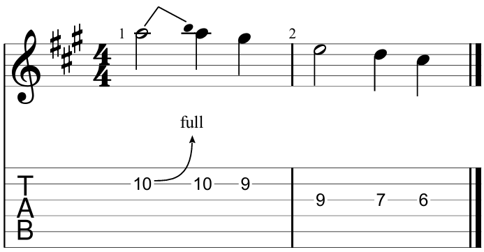 Bend the B string at the 10th fret up a full tone. Release it, descend through the B and G strings. That bend into the second note of A Major is a sound you’ll recognize from a lot of melodic rock playing.